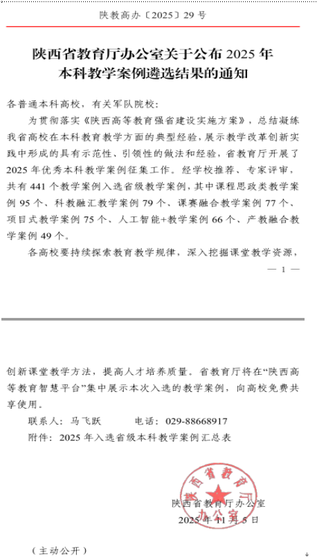 本次省级本科教学案例评选中,全省共遴选出课程思政类优秀案例95项。我院案例的成功入选,是陕西省教育厅对学院本科教学改革创新、课程思政建设成果的高度认可。下一步,学院将以此次入选为契机,持续深化课程思政建设,推动思政元素与专业课程深度融合,不断完善产教融合育人机制,全面提升人才培养质量,为学校“双一流”建设和高质量发展注入强劲动力。