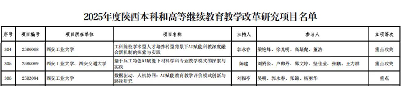 近日,陕西省教育厅公布了2025年度陕西本科和高等继续教育教学改革研究项目立项结果,我院工科院校学术型人才培养转型背景下AI赋能科教深度融合新机制的探索与实践等3个项目获批立项,且全部为重点攻关及重点项目,立项数量与高层次占比均创历史新高,标志着我院教育教学改革研究工作取得突破性进展。