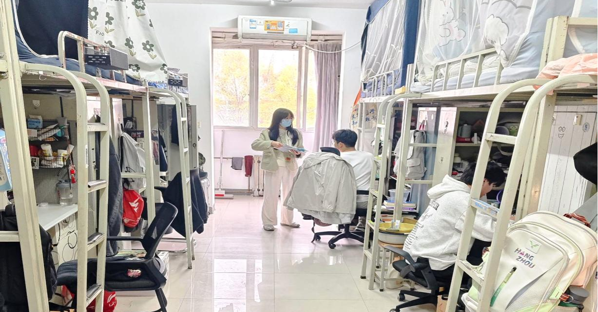 查寝过程中,马二妹着重叮嘱大家强化安全防范意识,自觉遵守宿舍管理各项规定,时刻关注用电安全,规范作息、文明相处,同时明确卫生要求,提醒大家及时清理个人及公共区域杂物,勤倒垃圾避免异味滋生,每日定时开窗通风保持室内空气流通,共同筑牢宿舍卫生防线。