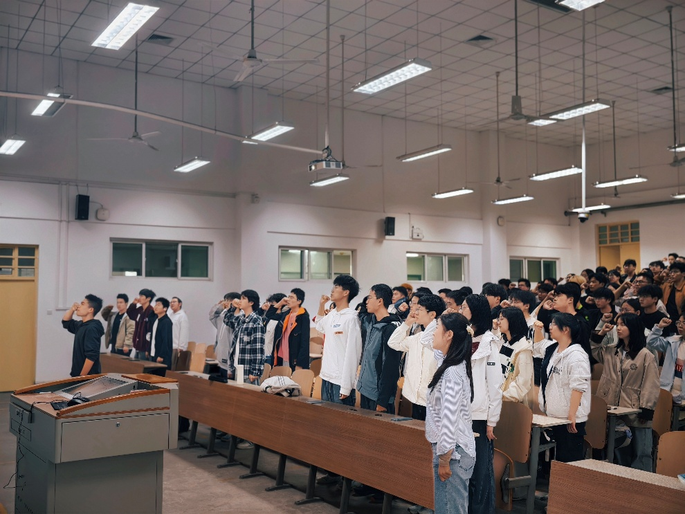 活动中,全体学生观看中国近代史主题视频感悟先烈牺牲与幸福生活的来之不易,随后辅导员围绕“什么是爱国主义”,从历史、现实、实践三方面解读其内涵,引导学子立足专业、勤学苦练,现场互动热烈。活动进入高潮环节,全体学生肃立起立,在领誓人唐钧腾的带领下庄严宣誓。铿锵有力的誓言响彻全场,既是对革命先烈的深切告慰,也彰显出新时代青年学子勇担使命的坚定信念与庄严承诺。