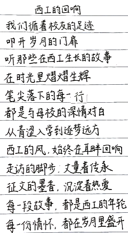 活动以“讲述西工故事”为主线,紧扣西安工业大学“兵工七子”的办学底蕴与“敦德励学,知行相长”的校训精神,鼓励同学们立足自身学习生活体验,挖掘校园中的感动瞬间与成长印记。活动期间,同学们积极响应、踊跃投稿,展现出极高的参与热情。