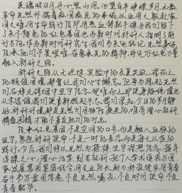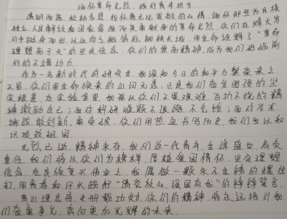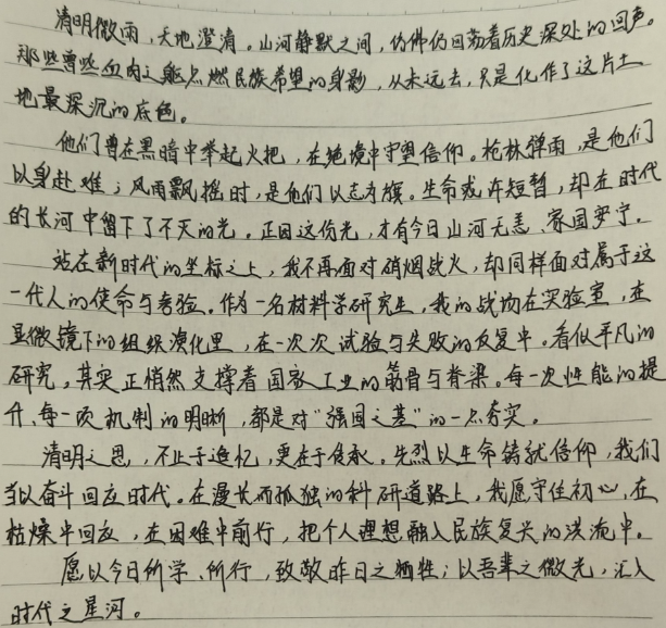 活动期间,同学们结合自身学习科研与成长感悟,纷纷撰写感言,表达新时代研究生爱国报国、奋勇争先的责任与决心。一篇篇饱含深情的感言,情真意切,既有对革命先烈的深切缅怀,也有对自身科研使命的深刻思考。有同学在感言中写道:“先烈们用生命铺就了今天的和平道路,作为新时代的研究生,更应以严谨求实的科研态度报效国家,将论文写在祖国大地上。”活动共征集到感言近百篇,充分展现了研究生群体奋发向上、勇担使命的精神风貌。